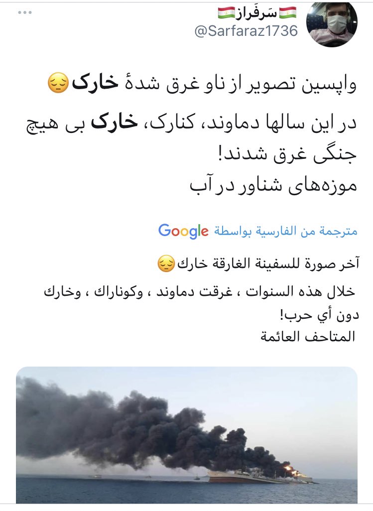 #إيران اليوم أيضًا عن فشل محاولات إطفاء الحريق في أكبر سفن الشحن العسكري#خارك ما أدى لغرقها - غالبية النشطاء الإيرانيون يستبعدون تعرضها لهجوم خارجي بسبب التهالك وبدائية عمليات الصيانة المعروفة للاسطول البحري. - المتاحف العائمة -pic.twitter.com/Fz7RhzfRtf