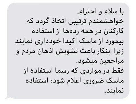 #حراست دانشگاه علوم پزشکی#خراسان_جنوبی با ارسال پیامک به کادر درمان و کادر اداری بیمارستانهای#بیرجند، استفاده از#ماسک را به دلیل تشویش اذهان عمومی#ممنوع کردpic.twitter.com/2CpNxBGJPn