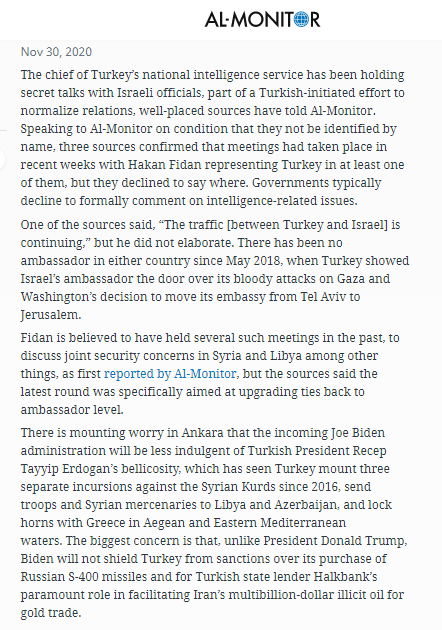 #أردوغان اللى كان يريد سحب سفيره من الامارات، بيسعي في السر لتحسين علاقته مع#إسرائيل في محاولة لفك عزلة#تركيا وبسبب مخاوف أردوغان من إدارة بايدن. رئيس جهاز المخابرات التركي هكانان فدان أجرى محادثات سرية مع مسؤولين إسرائيليين لتحسين العلاقات https://www.al-monitor.com/pulse/originals/2020/11/turkey-ties-israel-biden-trump-s400-saudi-arabia-erdogan.html …pic.twitter.com/6bh7Ce0Vf1