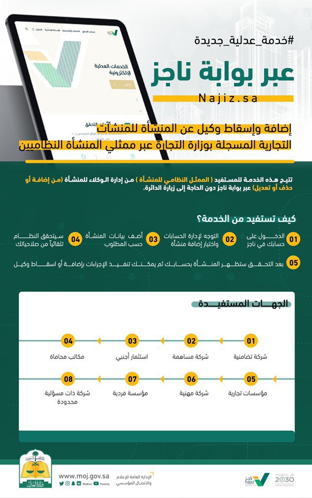 إضافة وإسقاط وكيل للمنشآت التجارية عبر بوابة ناجز دون الحاجة إلى مراجعة الدائرة .