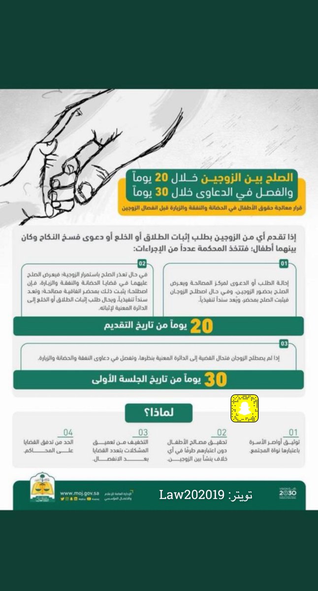 #الصلح بين الزوجين خلال ٢٠ يوم و#الفصل في الدعاوى خلال٣٠ يوم وقرار معالجة#حقوق_الأطفال في#الحضانة و#النفقة و#الزيارة قبل#انفصال_الزوجين#قانون#اعرف_حقك#اعرف_أكثر#معلومة_قانونية#يوم_المطلقات_العالمي#ثقافة_قانونية#حقوق#وزارة_العدل#السعودية#الاربعاءpic.twitter.com/RmxRii3qt0