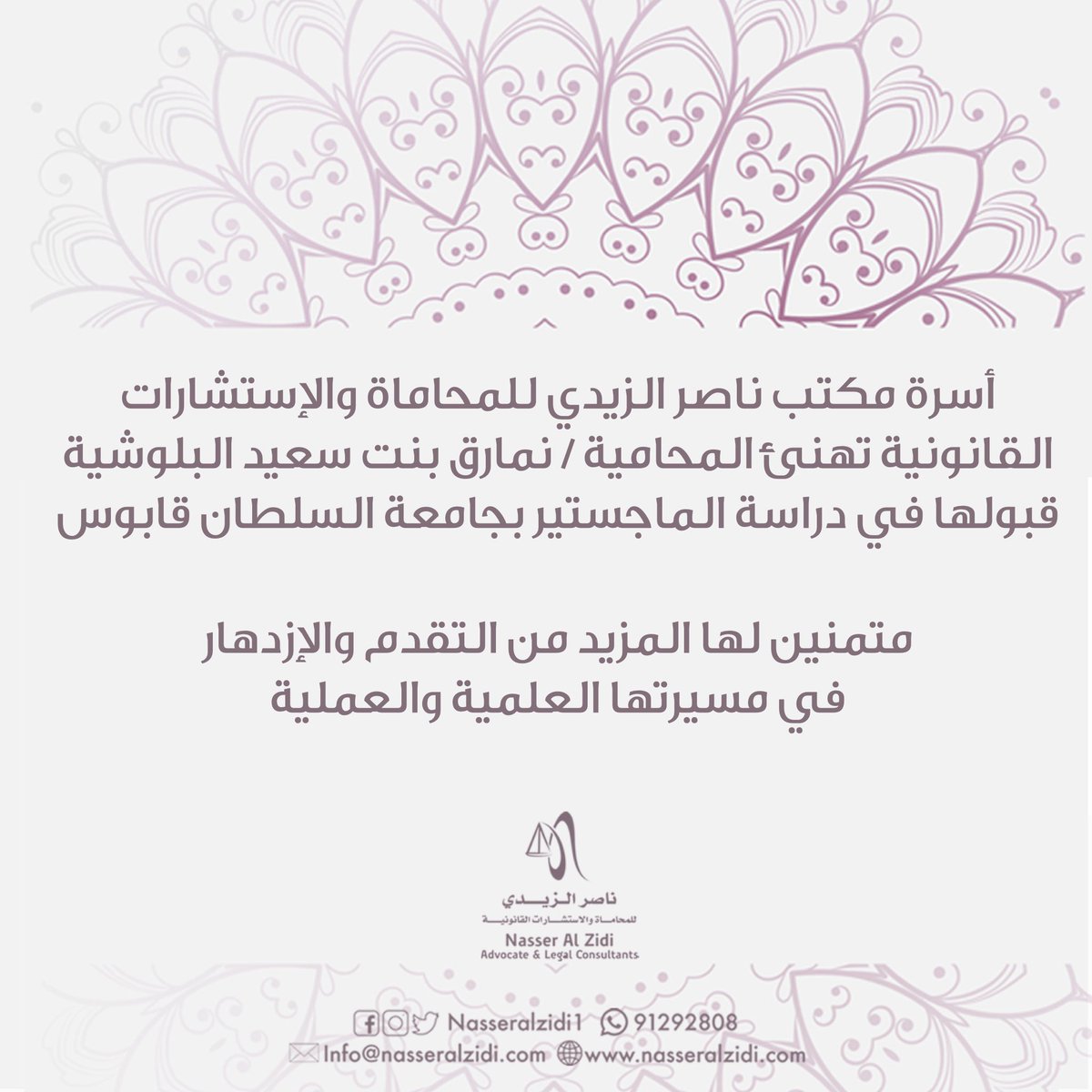نبارك للمحامية/ نمارق بنت سعيد البلوشية قبولها لدراسة الماجستير بجامعة السلطان قابوس في تخصص القانون العام، متمنين لها مسيرة علمية حافلة بالجد والإجتهاد. -