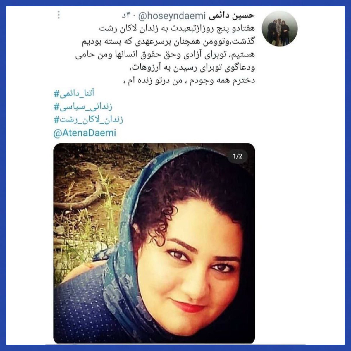 #آتنادائمی در همبستگی با دخترش در توییتر خود چنین نوشت ICHR قاطعانه خواستار آزادی فوریِ بدون قید و شرط#آتنا_دائمی و تمامی#زندانیان_سیاسی، میباشد. و جمهوری اسلامی را برای مجرم انگاری معترضان، و ۴دهه سرکوب سازماندهی شده محکوم میکند.