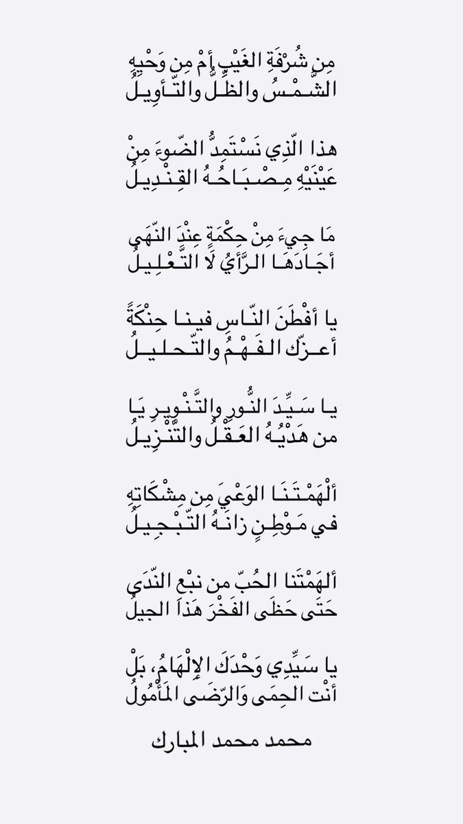 هذا الذي نستمدّ الضوء من عينيه مصـباحه القنديلُ ما جيء من حكمةٍ عند النهى أجادها الرأي لا التعليل يـا سـيد النّور والتنويـر يا من هديه العقل والتنزيل ألهمتنا الوعي من مشكاته في موطنٍ زانه التبجيل ألهمتنا الحب من نبع الندى حتى حظى الفخر هذا الجيل