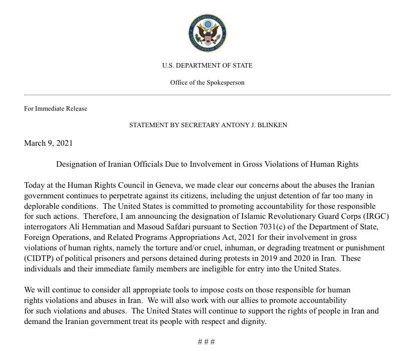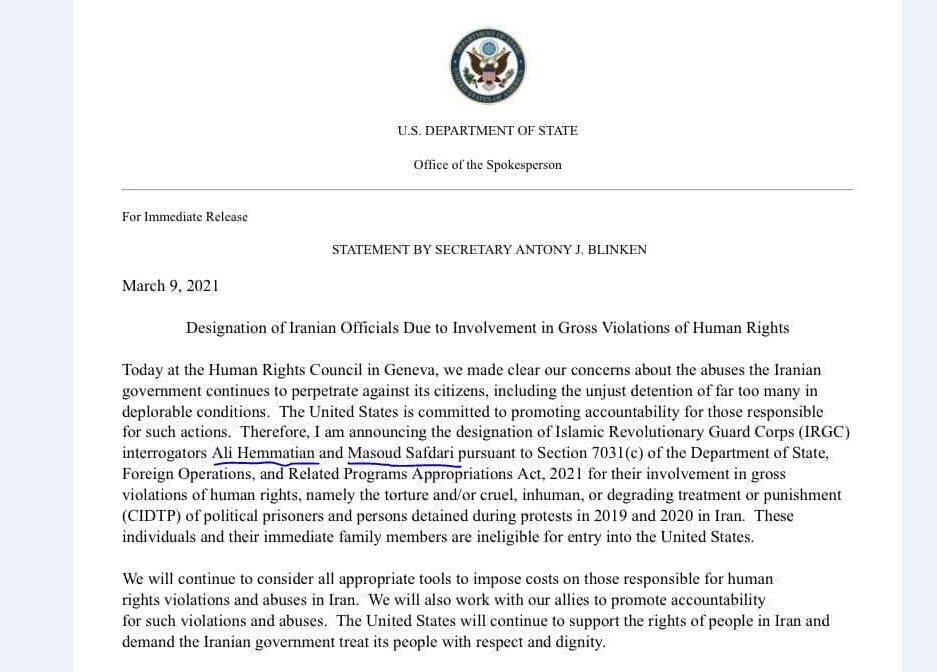#US State Department on Tuesday blacklisted 2 Iranian government interrogators, accusing them of torture and other#HumanRights violations, in what appeared to be the first such action against#Tehran under the#Biden administration.#علی_همتیان#مسعود_صفدری -