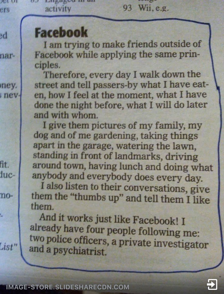 #فيسبوك على الناس#الشارع، اطلعهم على اكله وشربه وصوره الشخصية. لم يمارس شيئا يخالف ما يمارسه على فيسبوك. في نهاية المطاف نجح في الحصول على أربعة متابعين هم: ٢ من#الشرطة، محقق خاص، وطبيب نفسي.