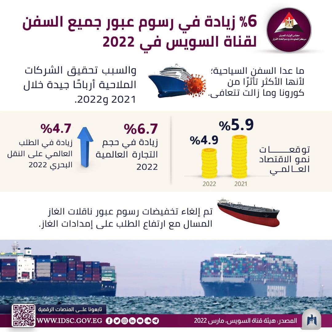 #قناة_السويس ترفع رسوم جميع السفن العابرة للقناة بنحو 6% في 2022، تماشيًا مع تحسُّن توقعات نمو الاقتصاد العالمي، ونمو التجارة العالمية والطلب العالمي على النقل البحري، مستثناة من تلك الزيادة السفن السياحية فقط التي تقف في الموانئ المصريه ..#تحيا_مصر