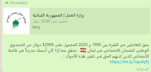 هل تلقيت رسالة واتساب بأن الضمان الإجتماعي سيمنحك مبلغ 2999 $ إذا كنت مسجلا بين 1990 و 2020 ؟ هذه الرسالة هي Spam إحتيال إلكتروني .. إحذر من إعادة إرسالها مع Link المرفق معها لأن الضغط على الرابط سيؤدي إلى سحب كل المعلومات من تلفونك لإعادة إستخدامها في عمليات إحتيال.