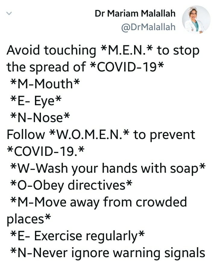 avoid touching MEN and follow WOMEN toprevent covid-19