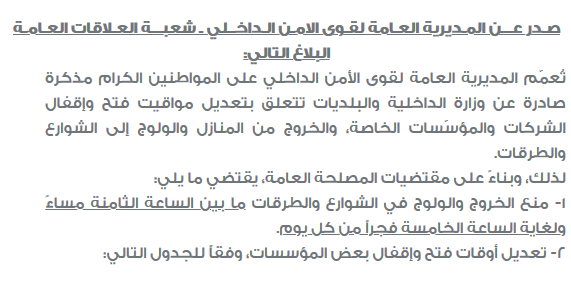 تعديل أوقات الخروج والولوج إلى الشوارع والطرقات وفتح وإقفال بعض المؤسسات الخاصة.