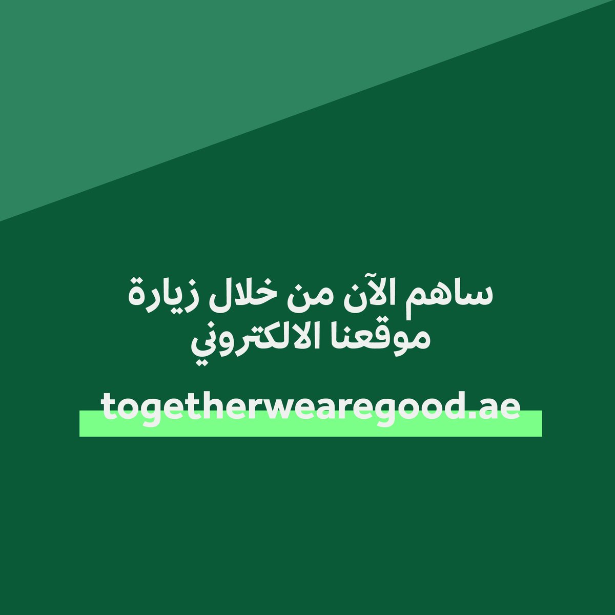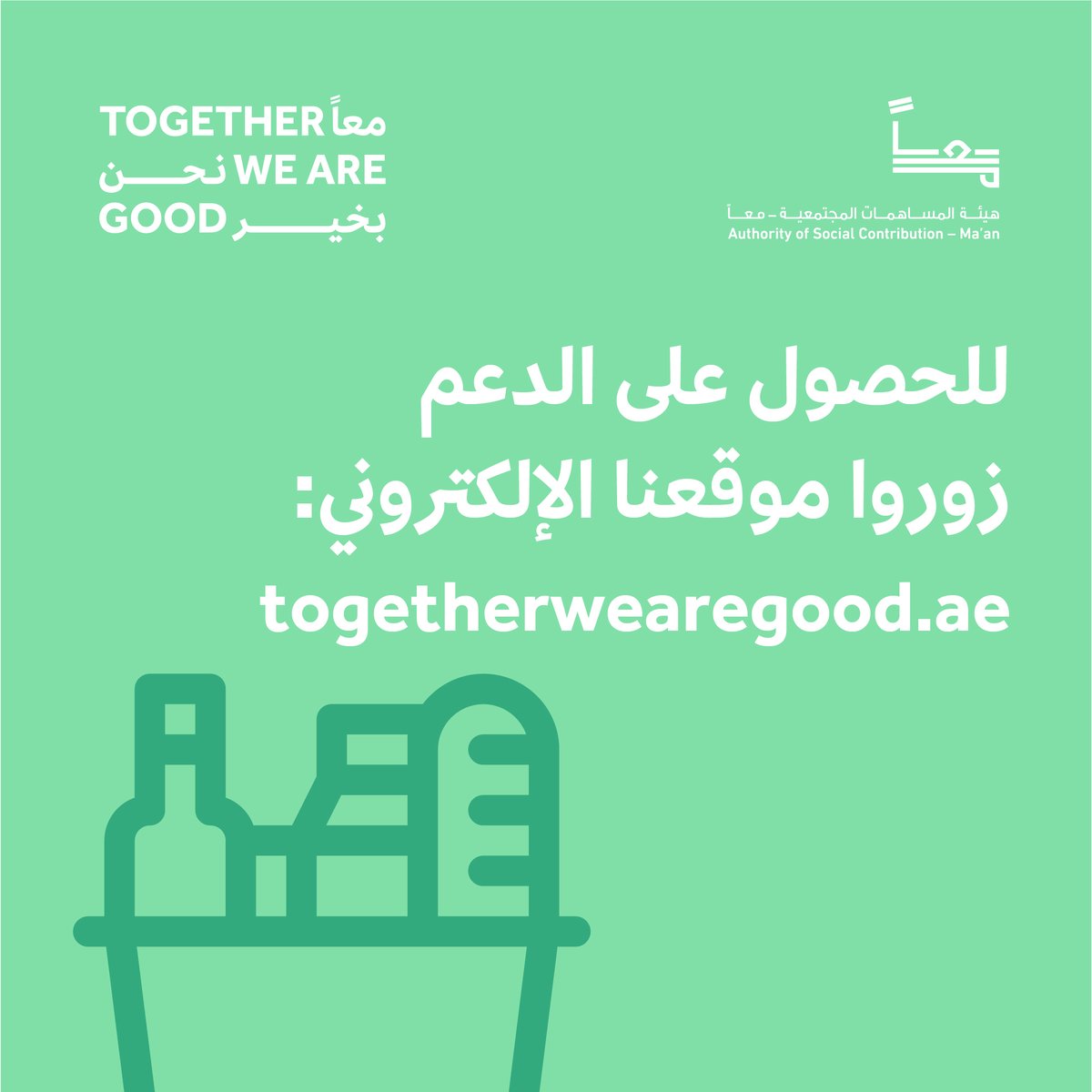 لستم بمفردكم في مواجهة هذه المرحلة الصعبة. بتكاتفنا وتوحيد جهودنا كمجتمع واحد يمكن لنا تخطي هذه التحديات غير المسبوقة، إذا كنتم تحتاجون إلى مساعدة خلال هذه الفترة، بادروا بتسجيل الطلب للحصول على الدعم على الموقع http://togetherwearegood.ae