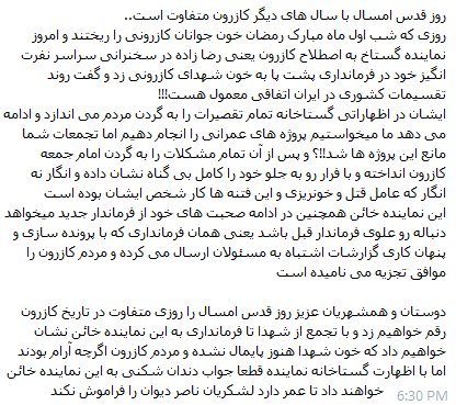 کازرون کوتاه نیامده و فریاد خونخواهی سر میدهد.این بار کازرون فردا سیستان محروم و کردستان زیر ظلم و خوزستان و ایلام و آذربایجان و همه ایران تحت ستم؛ بزودی بر علیهتان ایران قیام میکند. این حاصلید که خود کاشتید.