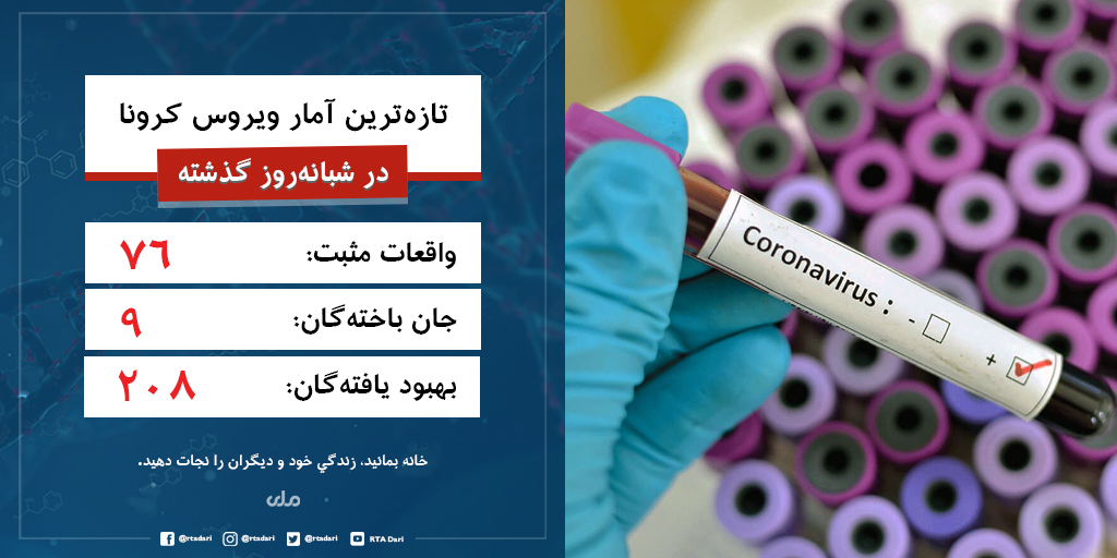 #کووید_۱۹ شناسایی و ۹ بیمار دیگر جان باختهاند. طبق اعلام وزارت صحت عامه، در شبانهروز گذشته ۲۰۸ بیمار کووید-۱۹ بهبود یافتهاند.#CoronaVirusUpdates#coronavirus#Afghanistanpic.twitter.com/INoSG9Gaf3