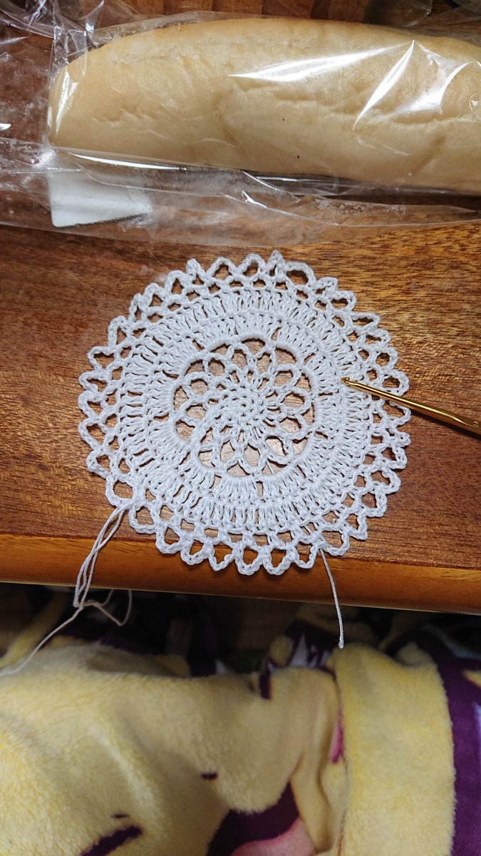 ドイリー?作ってみてるよ!このサイズで止めればコースターに丁度よさそうなんだけど、どうかなあ? 3、4枚セットで300円ぐらいでメルカリで売れるかなあ……