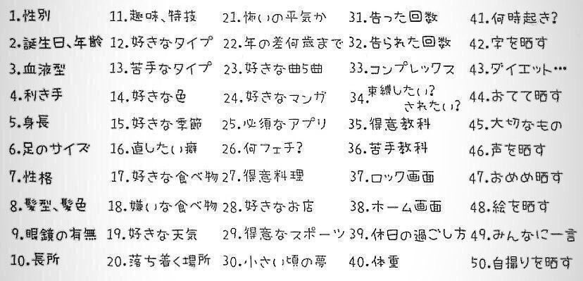 輝夜さんは ①:血液型 ②:体重 ③:苦手科目 ④:恋人はいるか ⑤:住んでる地方 ⑥:上の名前の一部 ⑦:好きなお菓子 ⑧:仲良くしたいフォローさんx3 ⑨:フェチ ⑩:1日「本人アイコン」 あんまり拡散しないでねww