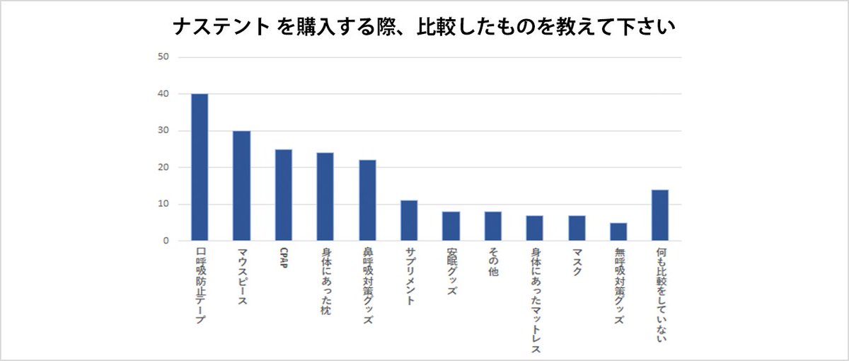 【ナステントのライバルは口呼吸防止テープ?!】 過去の自主調査結果によると、ナステントを購入する際に比較した対策として最も多いのが「口呼吸防止テープ」でした。果たしてこの2商品は競合するものなのでしょうか?