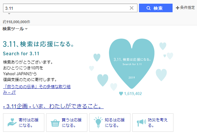 It is the 8th anniversary of the huge earthquake off the east coast of Japan that caused a tsunami. Every search of '3.11' on Yahoo JP today will raise 10¥ for the Tohoku area which is still rebuilding. https://search.yahoo.co.jp