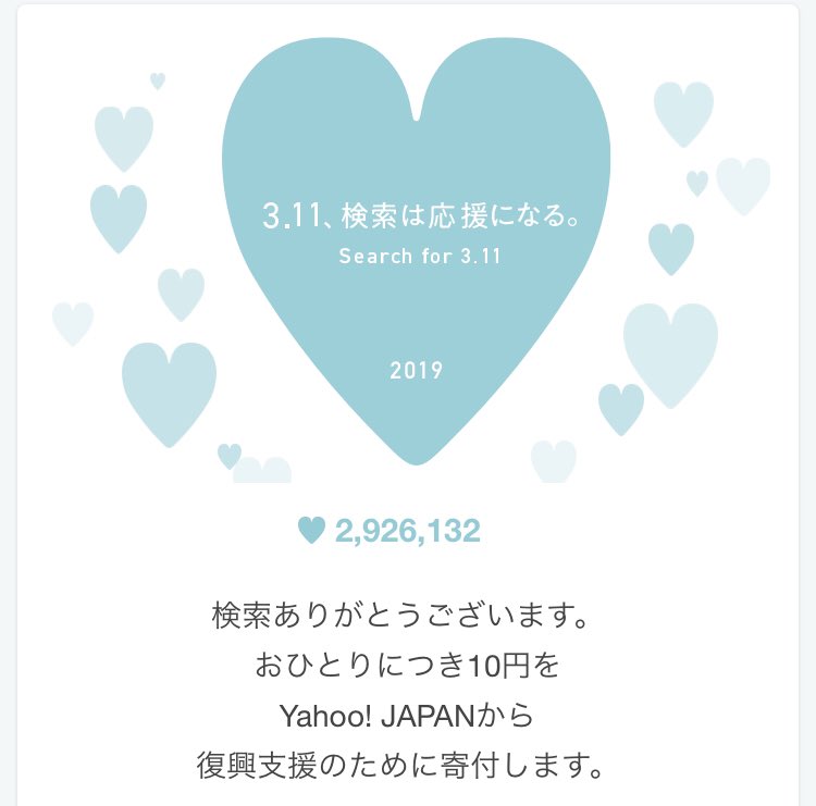 @YahooSearchJP will donate 10 yen to the post-recovery efforts. People are still recovering from this. https://fukko.yahoo.co.jp#検索は応援になる#Searchfor311#いま私ができること -