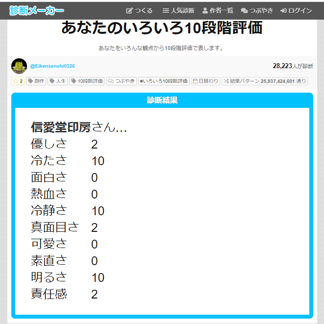 #いろいろ10段階評価#shindanmaker https://shindanmaker.com/947175 おもしろいかな?本人いたって真面目にやっております