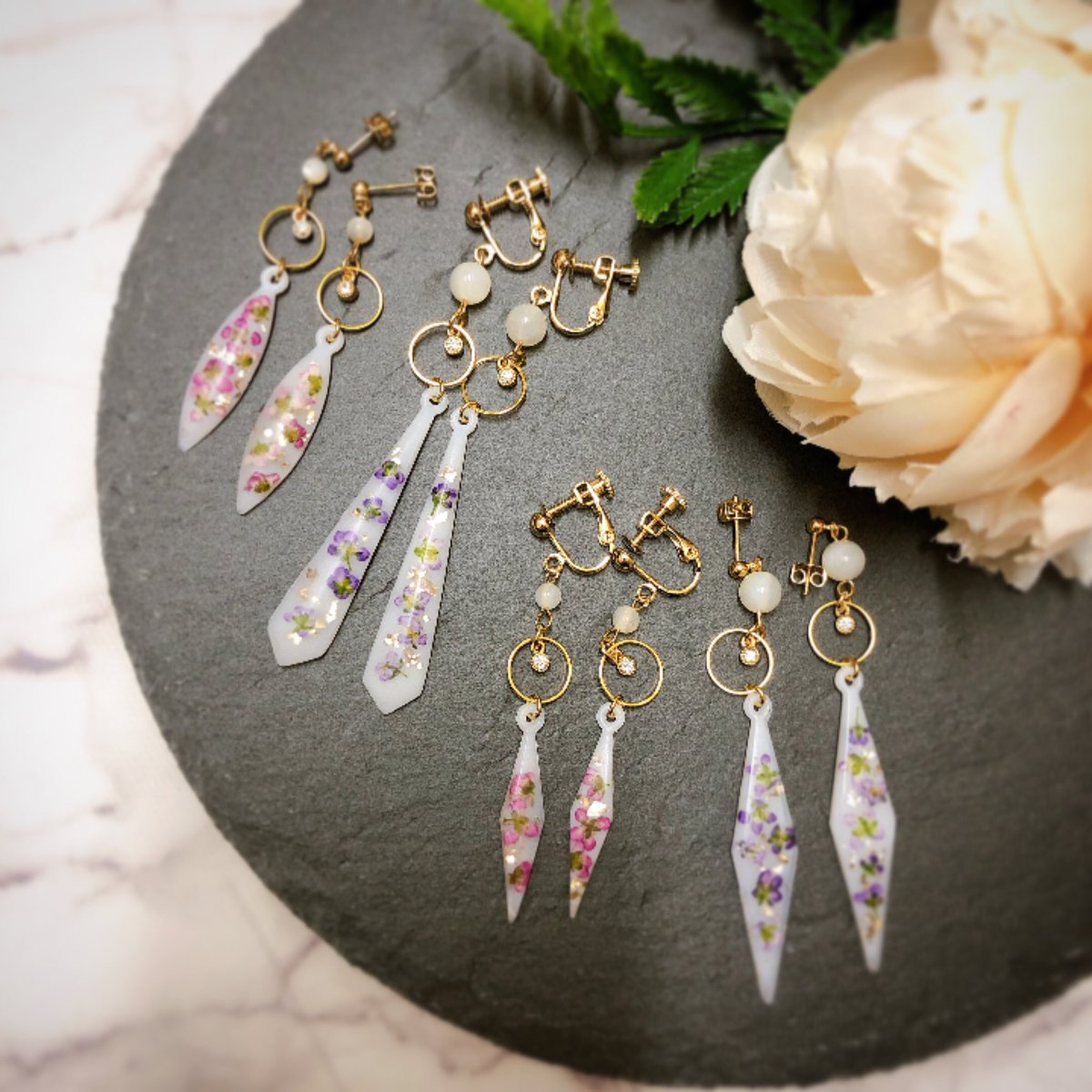 お花の可愛さをメインに、新しい型で作った子達と、ちょっと個性派なロングピアス