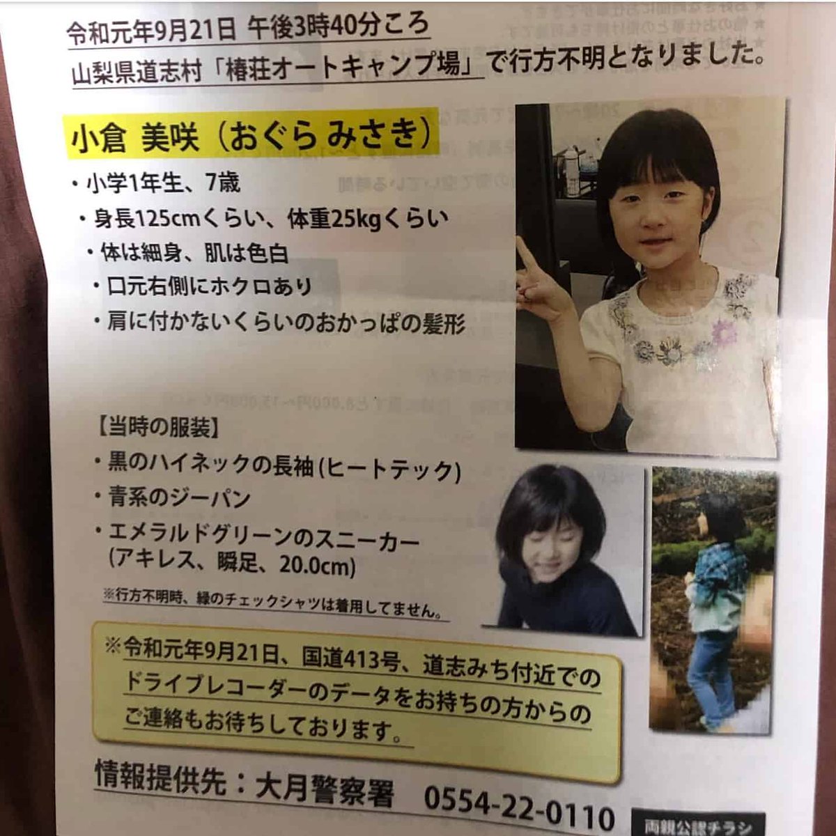 山梨県の椿荘オートキャンプ場で行方不明になった女の子です。 インスタのフォロワーさんのご自宅のポストにこれが入って居たそうです。拡散お願いします!