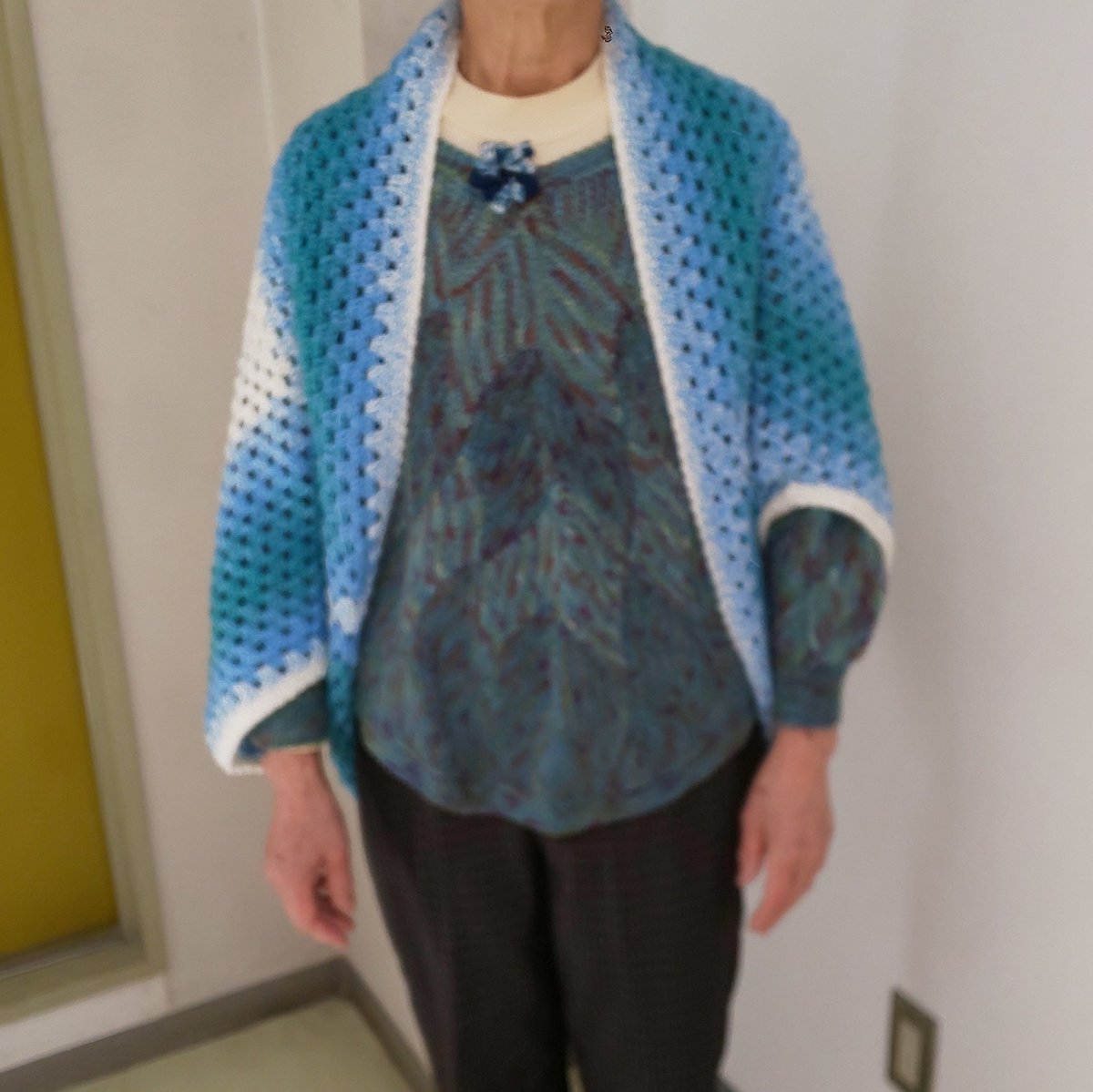 細身の人用のモモンガカーディガン 今年の始めに完成してたんだけどモデルさん探してて…今日、地元の編み物サークルでスリムなおばさまにモデルさんになって貰いました