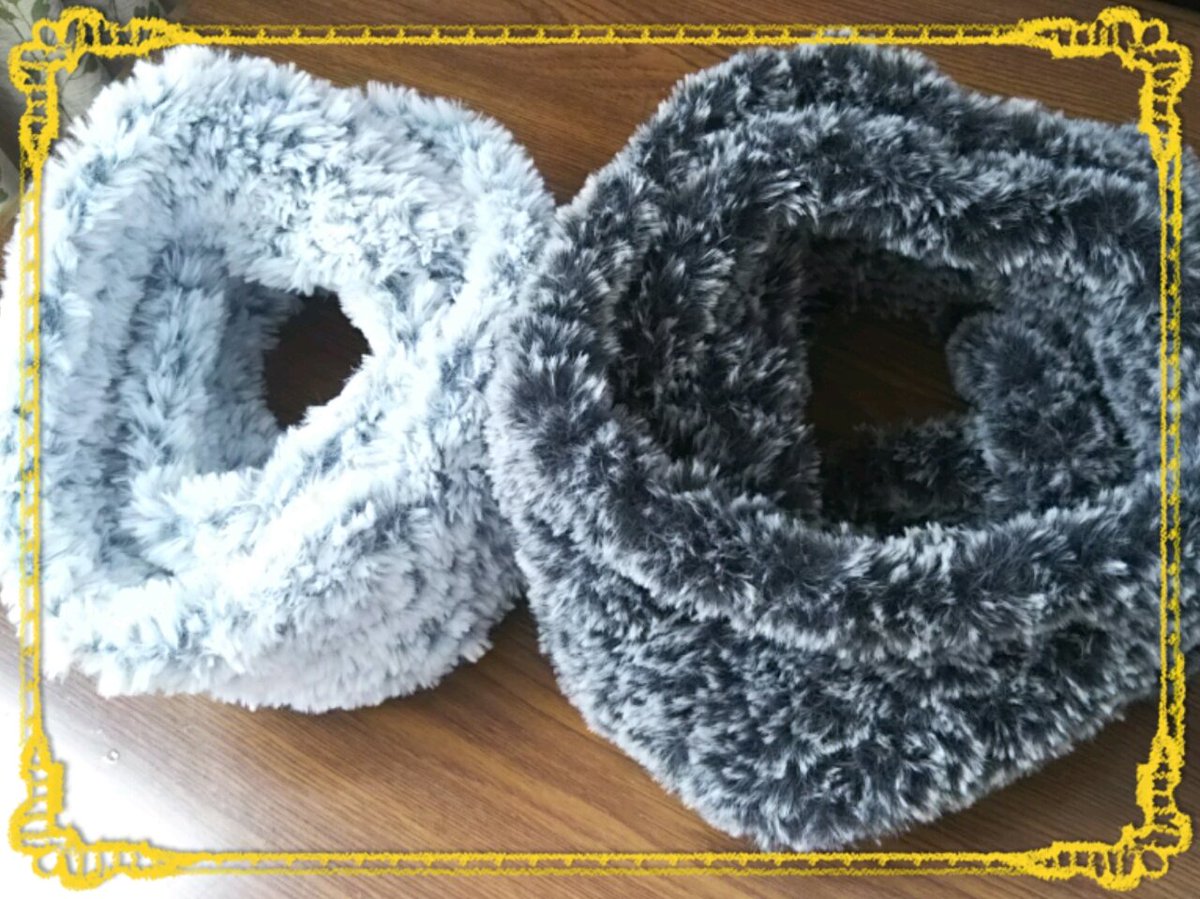 白がユザワヤで購入したファーヤーン1玉、息子用。黒がセリアのキャットヤーン8玉、私用。どちらも二重巻きで暖かい