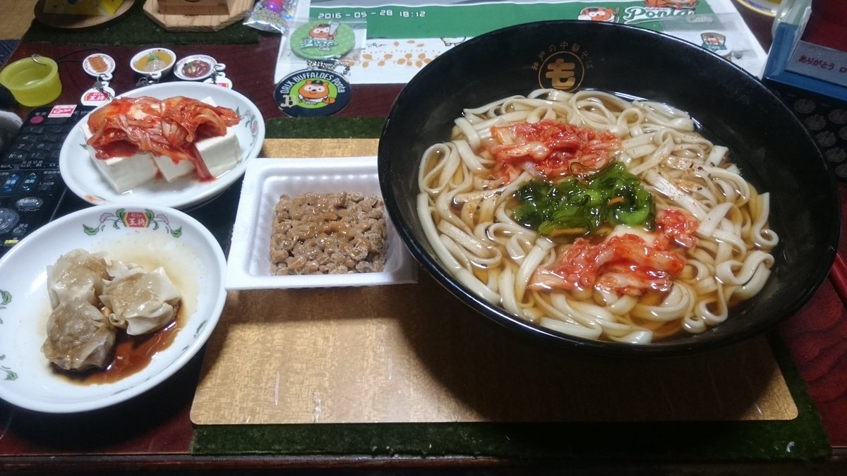 今日の自炊。 メインはキムチ野沢菜きしめんを作り、もっこすの黒鉢で頂きました♪ あとは豆腐キムチと焼売、納豆を。 焼売の存在がもっこすっぽい?(笑)