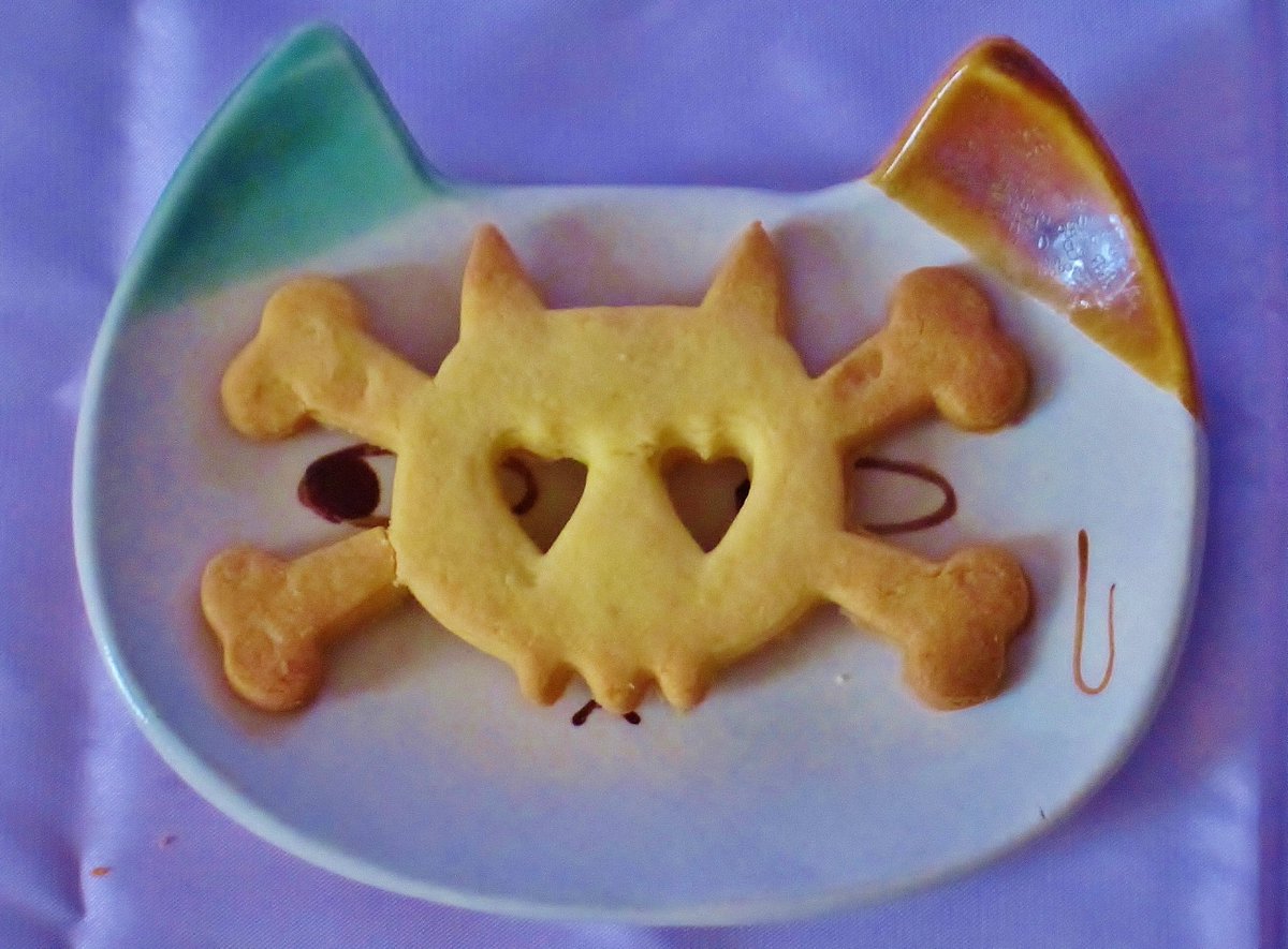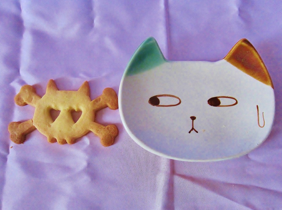 本日のデザートは「ミカヅキ個展・ビタースウィートサマー」で飲んだコーヒーのオマケに付いて来た『ミカヅキにゃんこドクロロゴクッキー』。撮影中に骨折してしまって残念ナリ…。