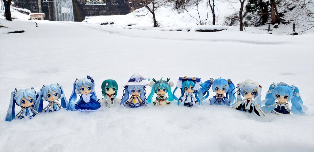 積雪がある場所で雪ミクさん10人揃って撮影に成功しました。ふわふわコート(雪ミク2012)さんの胸のリボンを家に置き忘れてしまい紺のドレスで対応せざる負えなかったです…