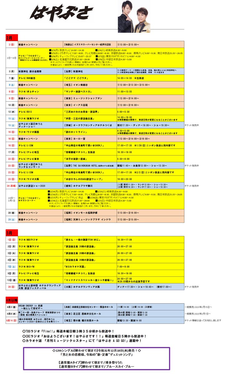#はやぶさ 2/1(土)出演情報】 ◆テレビ 18:00~20:00 J:COM 「大鵬薬品スペシャル『演歌男子。LIVE TOUR2019五周年ノ宴』inSAPPORO」 ※2/2にも放送あり ◆『酔わせて朝まで』購入イベント