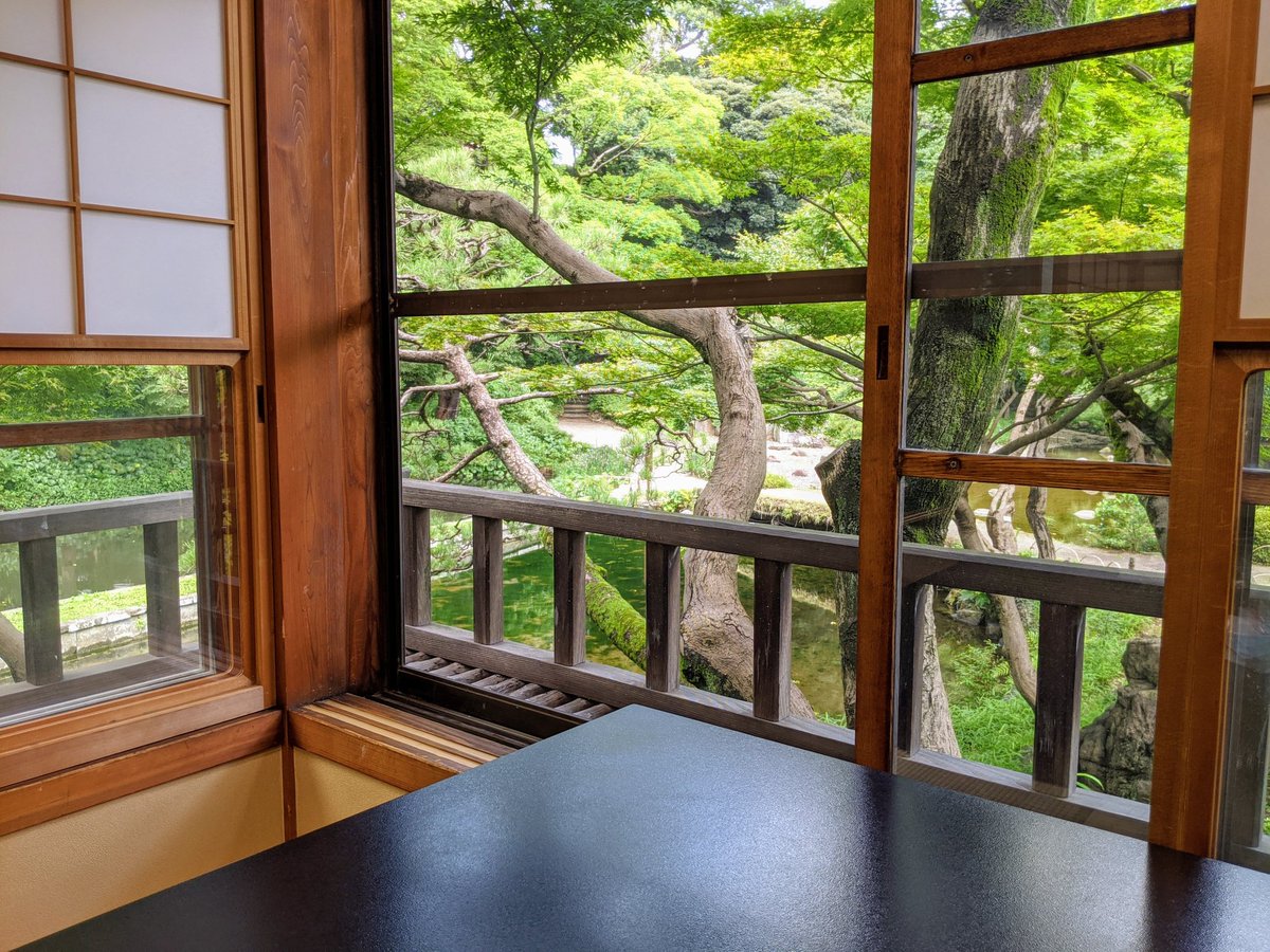 大変にお待たせをいたしました!涵徳亭の「お休み処(レストラン)」が、本日から営業を再開!新緑の庭園と一緒に、お抹茶もお楽しみいただけます。