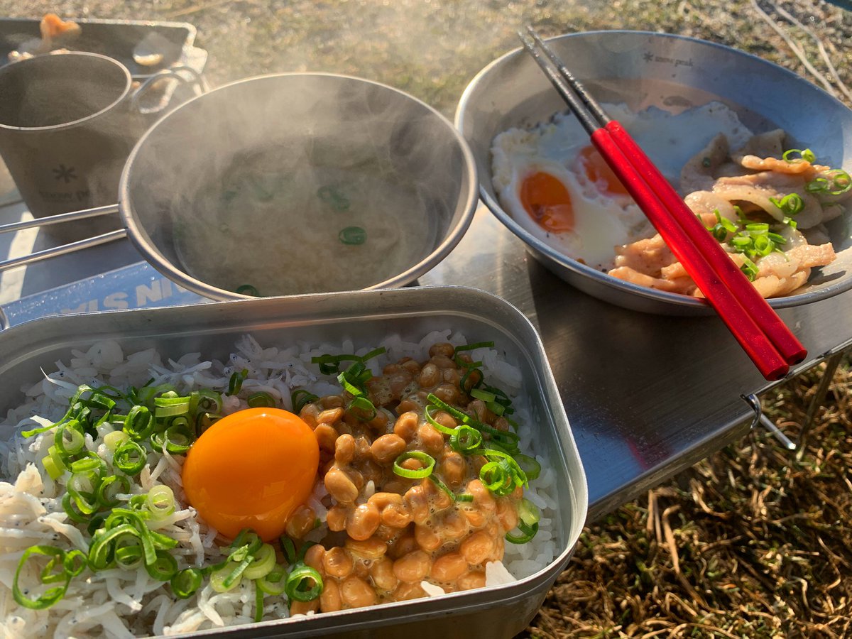 #キャンプ飯#納豆としらす丼#目玉焼き#昨日食べなかったネギ塩カルビ#あさりの味噌汁#メスティン#ふもとっぱらキャンプ場 2020.02.02撮影 pic.twitter.com/5pi1KFSjHE