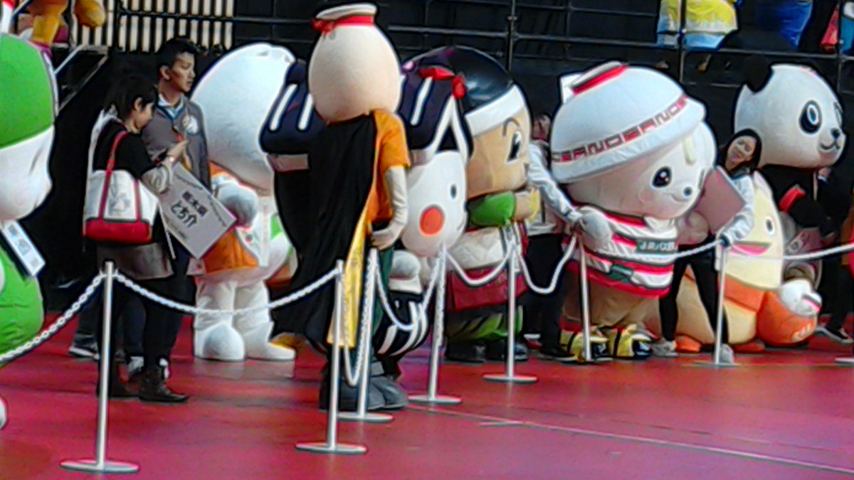 #ふるさと祭り#ふるさと祭り東京 14日の#ご当地キャラ体育祭 ③#くまモン#ざまりん 後ろ姿( ´艸`)#タボくん#和倉温泉わくたまくん#さのまる の後ろをヨチヨチついてってる風な#とち介 横向きの#ブラック番長pic.twitter.com/Kl3AgoZUFV