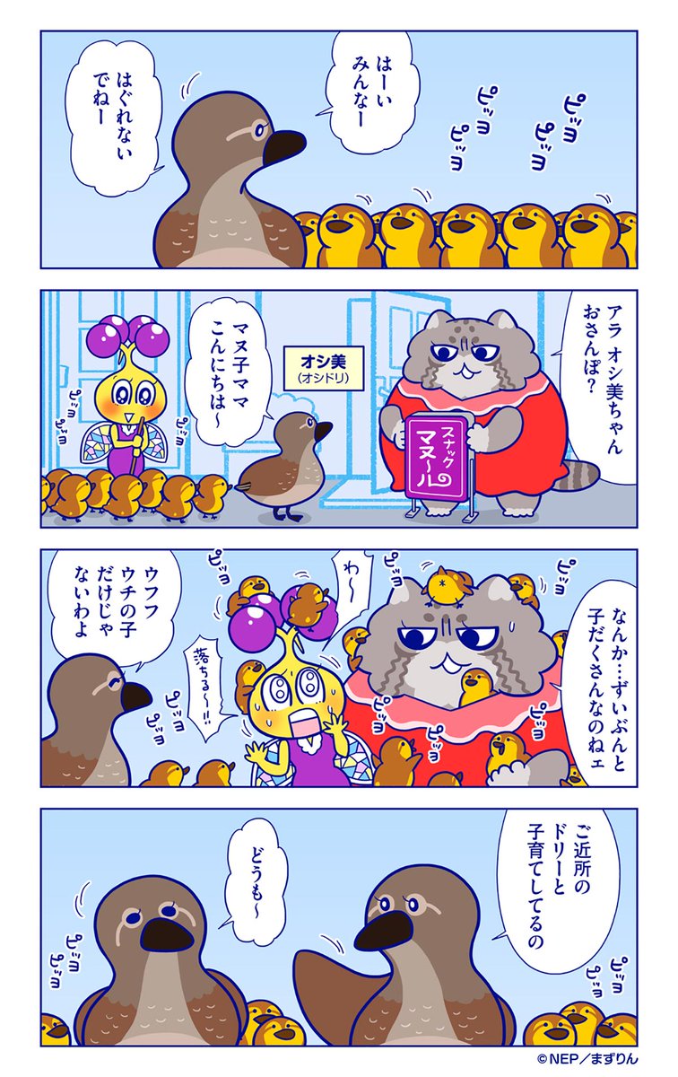 【スナック「マヌ~ル」準備中!】 お店前を掃除中、オシドリのオシ美ちゃんとそのベビちゃんたちにご挨拶! …しかしなんだか、ものすごい子沢山なようで…? ↓これまでのお話も公開中~ http://www.nhk.or.jp/darwin/comic/