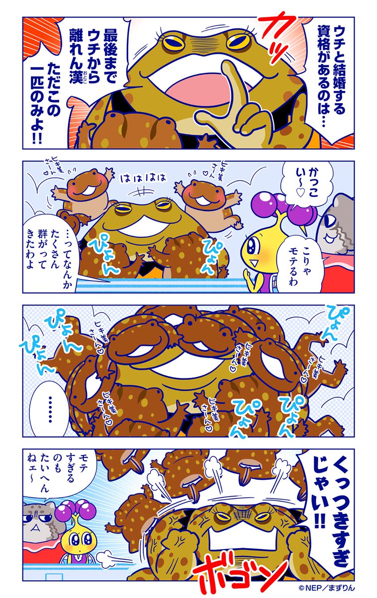【スナック「マヌ~ル」営業中】 今日のお客様は、ナガレヒキガエルのヒキ美さん! モテまくるタフネス女子ですよ。抱きついたら離れない気骨のあるオスが好みなの! ↓これまでのお話も公開中~ http://www.nhk.or.jp/darwin/comic/