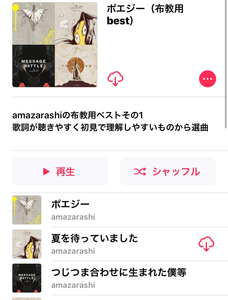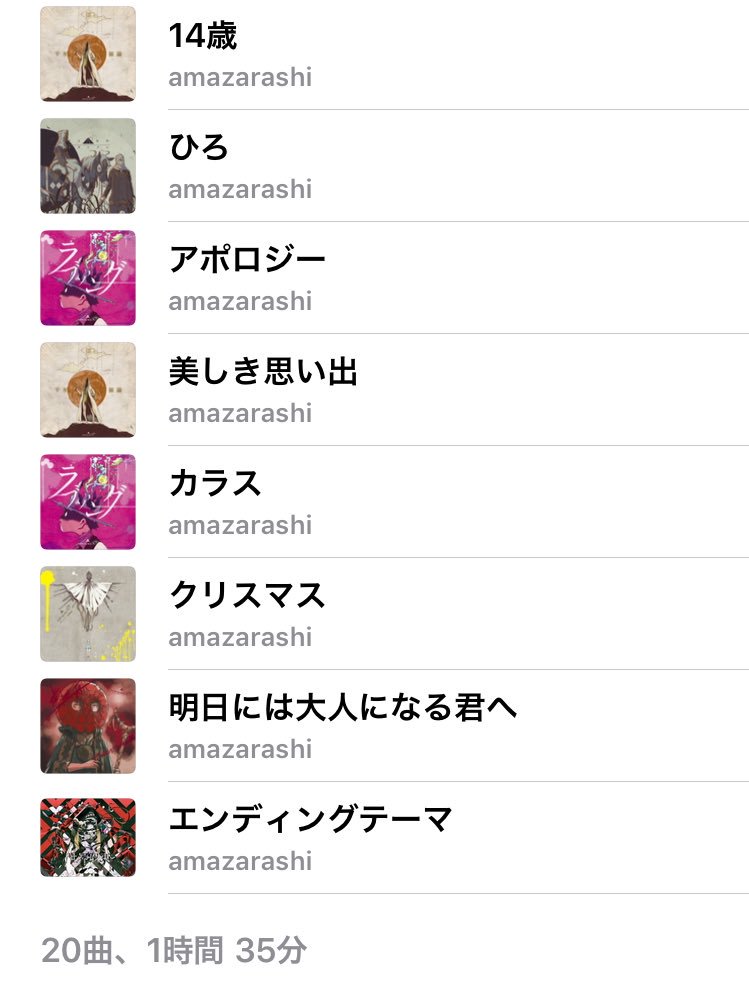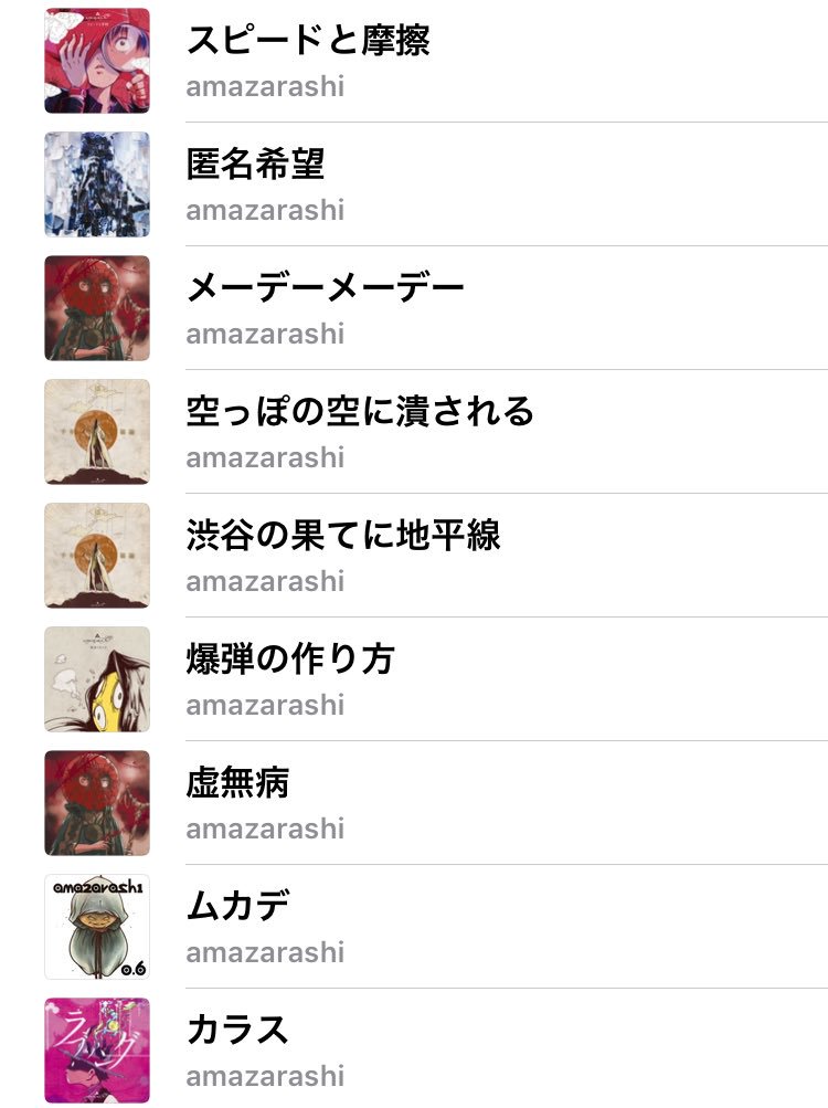 前回の反省(>RT)を活かして、今回は1時間以内でamazarashiの布教用プレイリストを作ってみた(11曲フルアルバムサイズ) 空に歌えばがfullverになると完成かな 満足(*´ω`*) ←布教用ェェ