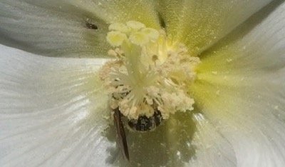 #アオイ科#ハチ「花 と#ポリネーター」芙蓉(白花)に潜り込んで蜜を舐めているヒメハラナガツチバチ。花粉だらけ。pic.twitter.com/n7JF2HIz9z