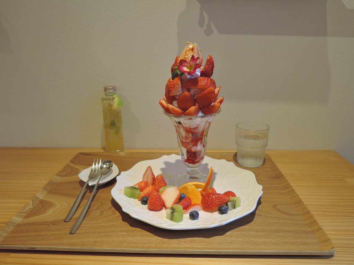 茅場町(住所は新川)のめめたおる 「こぼれ苺パフェ」と「苺パンケーキ」で悩んじゃう こぼれ苺パフェに決定 この日は7種類のイチゴを使用