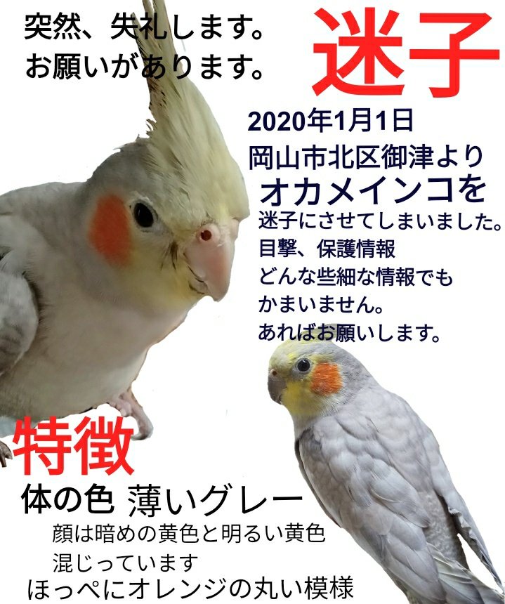 【オカメインコ探してます】 何度もツイートして申し訳ございません。未だ何も情報がないです…。目撃、保護、県外でも良いので似た子がいたら教えてくださると助かります(>_<)