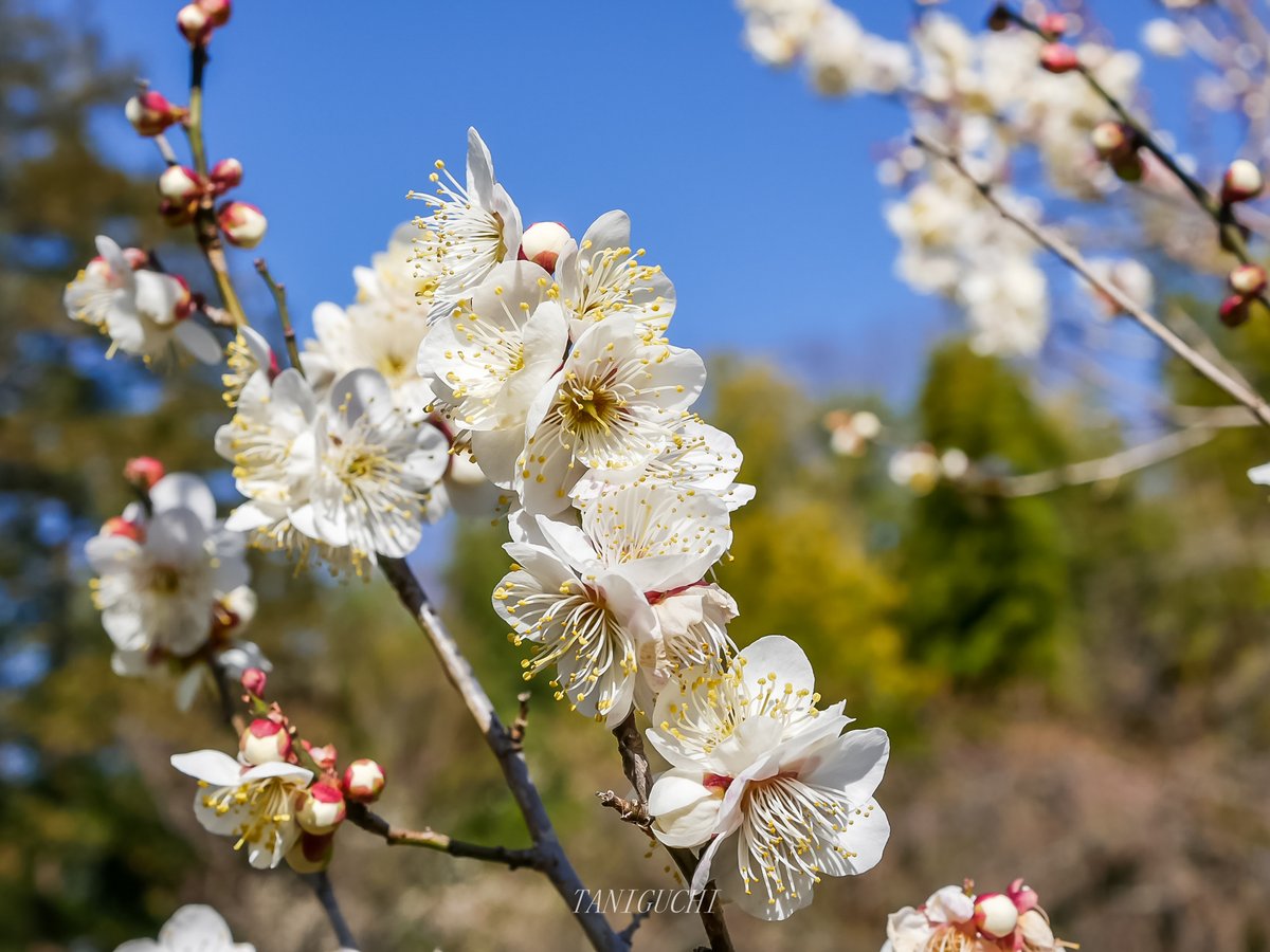 春迎えの花とも言われる梅の花。見上げた青空に今日は『白加賀』がとても綺麗。梅香る庭園でやさしい春を感じてみませんか?