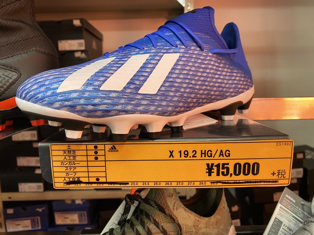 アディダスX19.2HG/AGが入荷しました。足の甲が高いプレーヤーにオススメ。ハードグラウンド、人工芝にも対応するにくいやつ!!