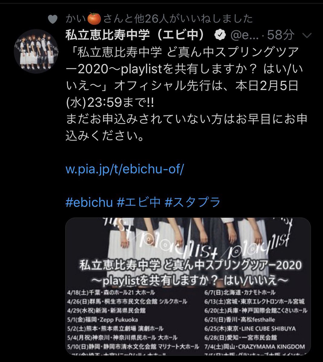 「私立恵比寿中学 ど真ん中スプリングツアー2020~playlistを共有しますか? はい/いいえ~」オフィシャル先行開始! 【受付期間】 2月1日(土)12:00~2月5日(水)23:59 https://w.pia.jp/t/ebichu-of/