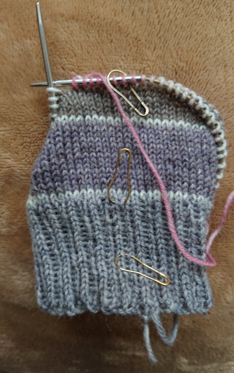 母に頼まれた靴下編み始めました。私は履き口から。つま先からも習得したい~ ピンクが入ってきたから変化が楽しみ