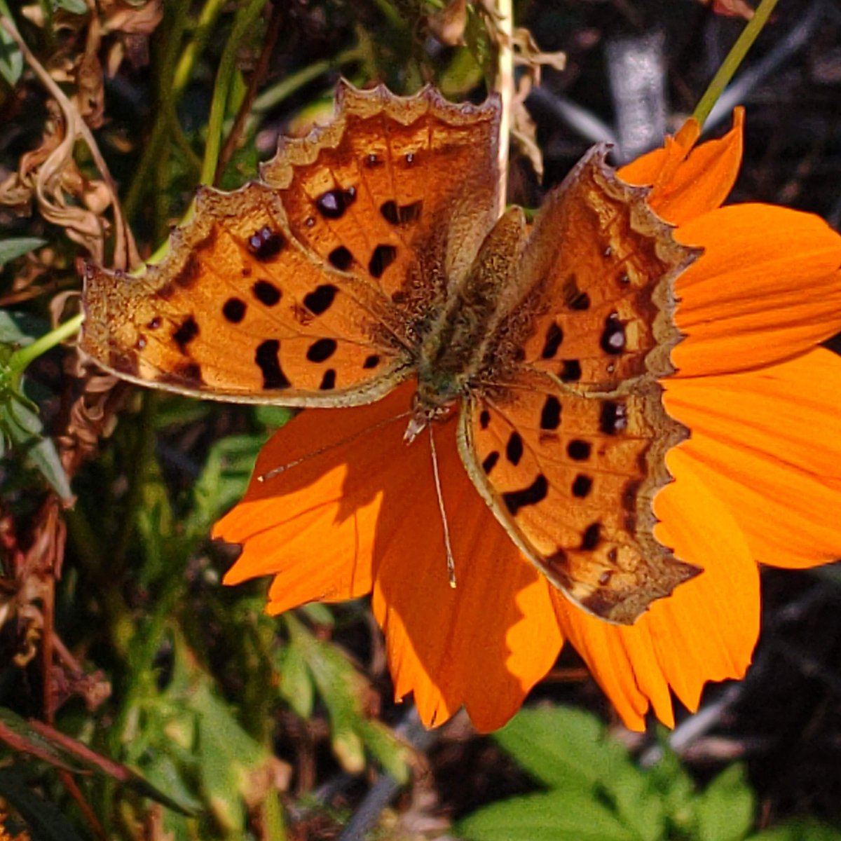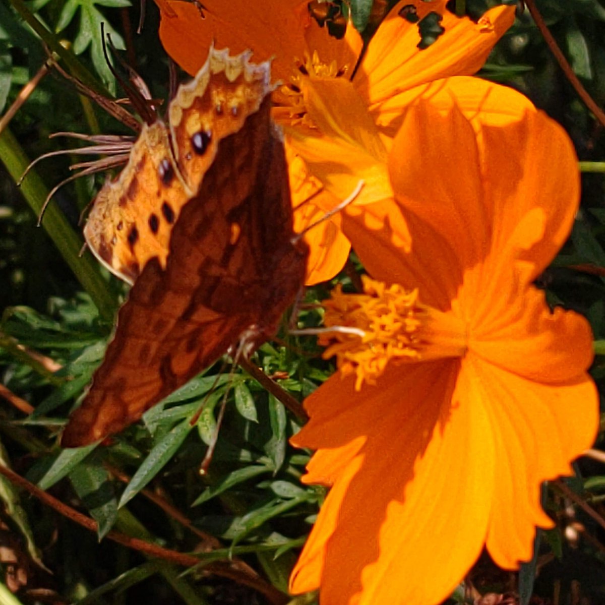 #キタテハ#キバナコスモス 昨年九月下旬にスマホで撮った、キバナコスモスの蜜を吸うキタテハ。 キバナコスモスは蝶達には人気な様で、他にアカタテハ、ヒメアカタテハ、ツマグロヒョウモン、アゲハチョウ、イチモンジセセリ、モンキチョウ等が来ていました。それに比べてコスモスは不人気な様で。 pic.twitter.com/Q2SH70gwK6