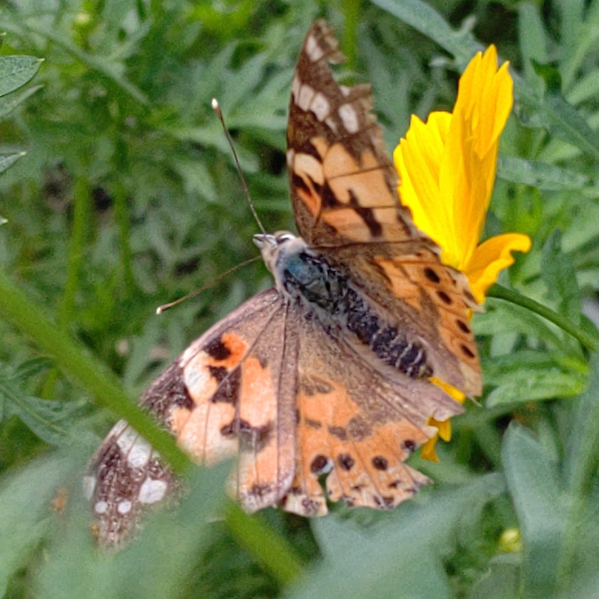 #ヒメアカタテハ#キバナコスモス 昨年八月下旬にスマホで写した、キバナコスモスの花の蜜を吸う、翅がくたびれたヒメアカタテハ。 pic.twitter.com/PC31295bmh