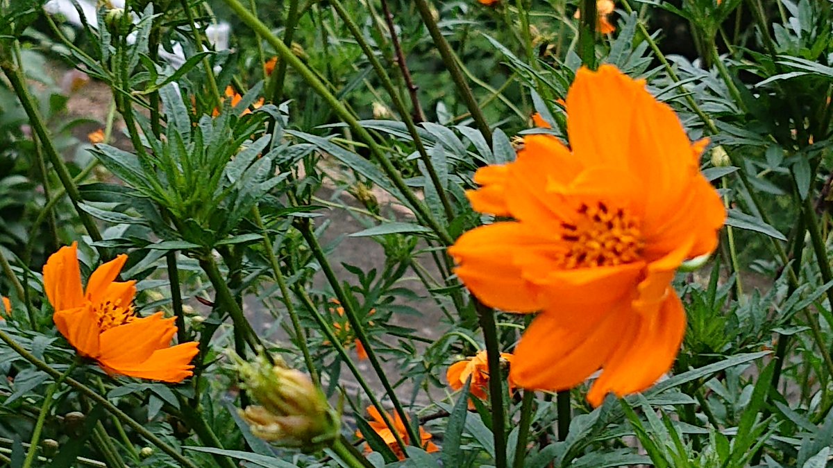 #キバナコスモス 黄、オレンジ、赤 コスモスの仲間で黄色やオレンジ色しかなかった事が名前の由来。 一株では種が出来ないので、2株以上で苗を育てる。 葉っぱはコスモスより太くギザギザで、こぼれ種で自然に芽が出て育ちます。 キバナコスモスは毎年どんどん増えて、庭が華やかになりました。(^-^) pic.twitter.com/lcN7NZF737