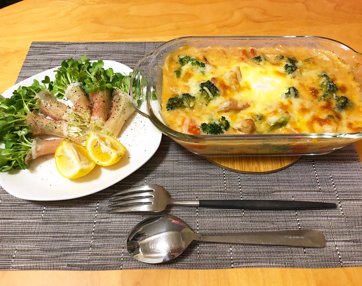 今夜の男子料理は「鶏肉と野菜のグラタン」と「生ハムのカイワレ巻き」です