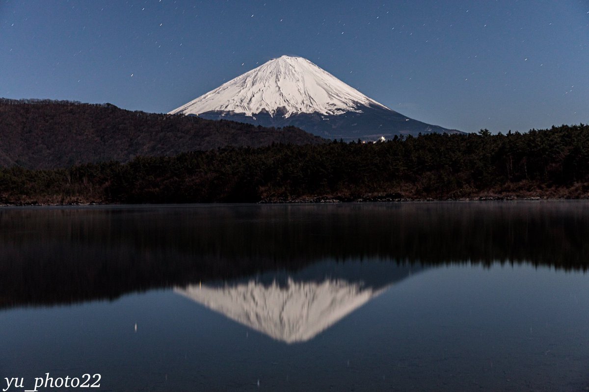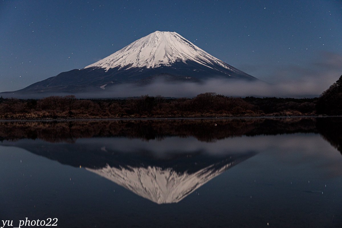 月明かりに照らされた富士山と湖のリフレクションが綺麗でした