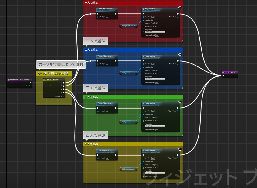 今日はプレイヤー人数を選択するUIを作っています。選択中のUIのマスクアニメーションを再生する関数を作り、カーソル位置を動かす毎にその関数を呼び出して使いまわし、アニメーションを更新していきます。